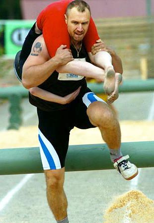 เมืองซอนกกายาวิ ประเทศฟินแลนด์เป็นสถานที่ "แข่งขันอุ้มเมียชิงแชมป์โลก" ในประจำเดือนกรกฎาคมของทุกปี การแข่งขันนี้เพิ่งเริ่มขึ้นในทศวรรษ 1990 แต่คนท้องถิ่นบอกตลกๆ ว่ามันเริ่มมาชั่วนาตาปีแล้ว เพราะเมื่อก่อนผู้ชายจะขโมยผู้หญิงจากหมู่บ้านอื่นมาเป็นศรีภรรยา วันนี้รางวัลไม่ใช่ภรรยาและเป็นเบียร์น้ำหนักเท่าตัวภรรยาของพวกเขา ผู้ชายจะแบกภรรยาของ ตัวเอง หรือของเพื่อนบ้าน หรืออาจเป็นคู่รัก เทคนิกการอุ้มมีหลายวิธี แต่ในภาพนี้เป็นเทคนิคที่นิยมมากที่สุด และก็สำเร็จมากที่สุดด้วย สถิติโลกที่รอให้ทลายคือการอุ้มผ่านสิ่งกีดขวางระยะทาง 235.5 เมตรในเวลา 55 วินาที